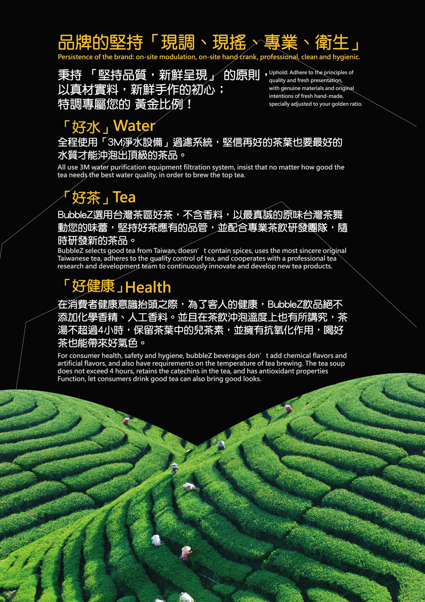 Our principles are「Insist the quality」and 「Freshly presented」,use「Quality water」、「Quality tea」、「Healthy」 as a starting point ,chooses tea from Taiwan tea area,use "3M water purification equipment" filtra-tion system ,never added with chemical flavors or artificial flavors ,by the way of pure flavors of tea ,create happiness aftertaste.