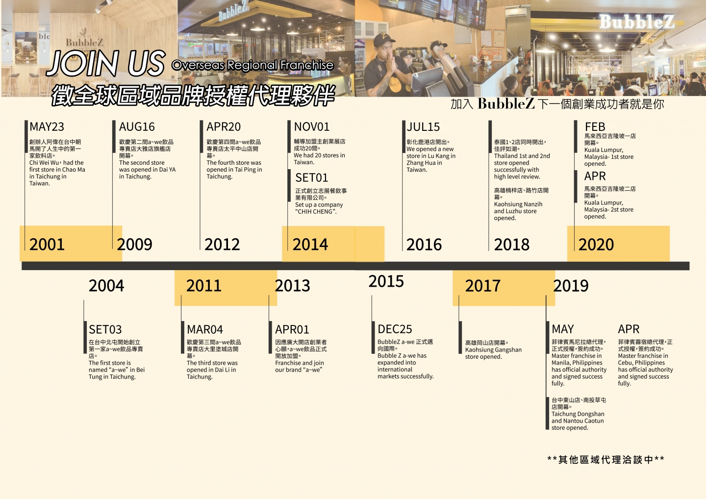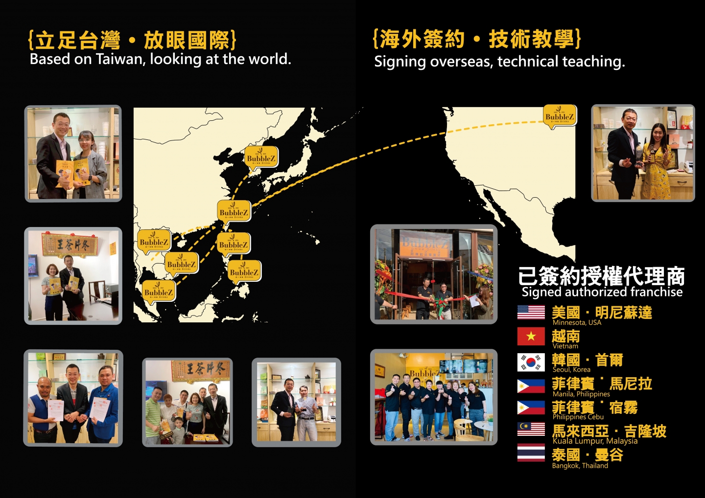 In 2001,BubbleZ was founded in Taichung, ,which's symbolizes pure, flawless and wonderful moments. In this unpredictable market,BubbleZ funder A Wei constantly learning and improve skill make BubbleZ not only development in Taiwan but susscefully expand to Indonesia,Vietnam,Thailand and Philippines,even have master franchisee in Cebu.
