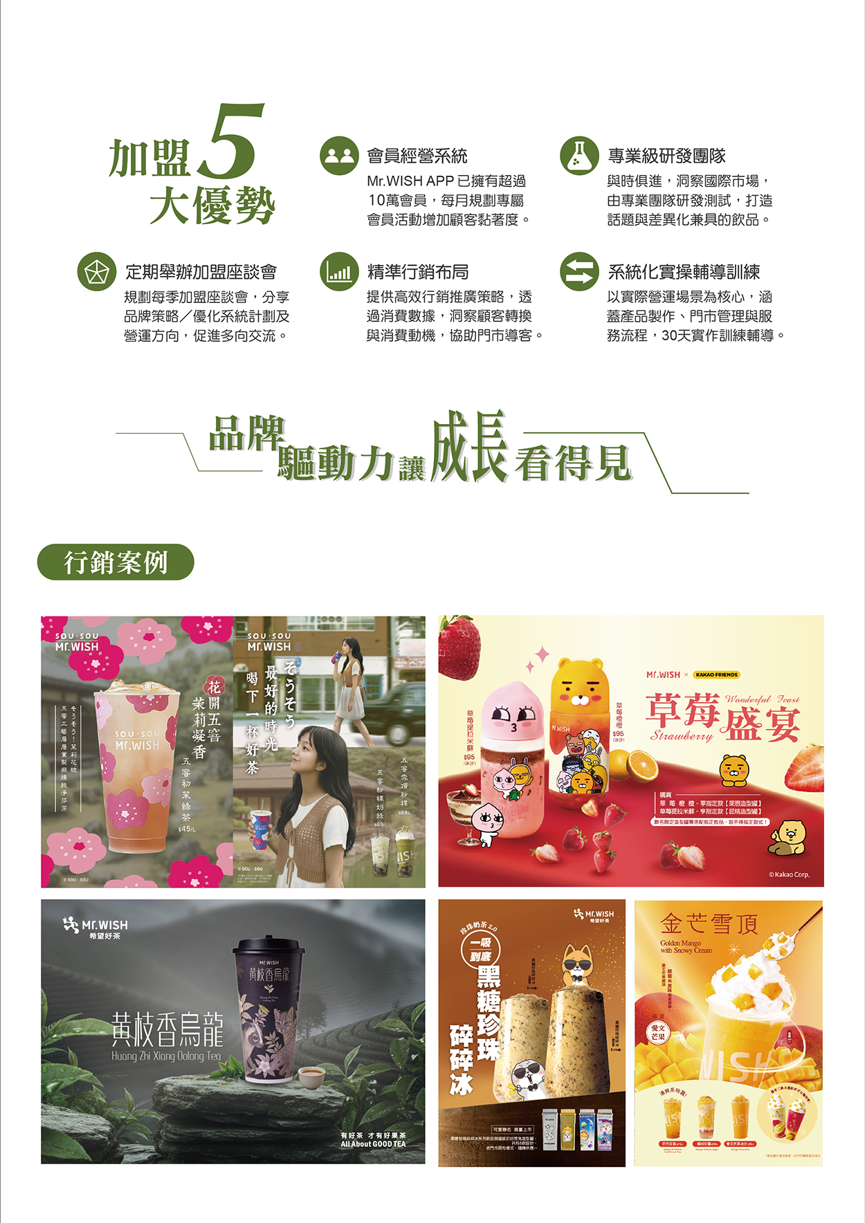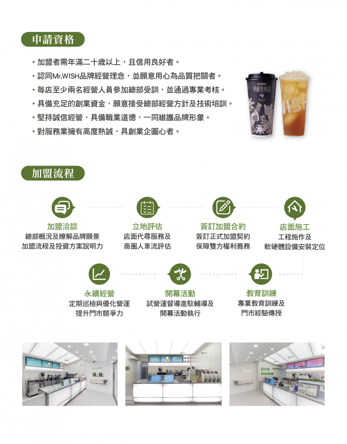 Mr.WISH 希望好茶 加盟金:請洽總部 營業項目:水果茶手搖飲 加盟專線:0800-311-788 FB粉絲團: https://www.facebook.com/Mr.WishTaiwan/ 官網連結 品牌介紹: Mr.WISH 希望好茶一一致力於新式茶飲美學的創建。 以「堅持、專業、純粹」為核心,宣告一場對品質與品味的全面升級。 我們的理念是:「以匠人之心,將鮮果的初衷昇華為茶飲的美學。」這是一份對自然原味的最高尊崇與堅守。我們為每款飲料定制最適合的茶底,達成風味的精確佈局與結構平衡,確保飲品在視覺分層和味覺層次上均達到精品級水準。 Mr.WISH 希望好茶所提供的,不僅是好喝的茶,而是通過專業團隊策劃,創造希望與美好的品鑑之旅。