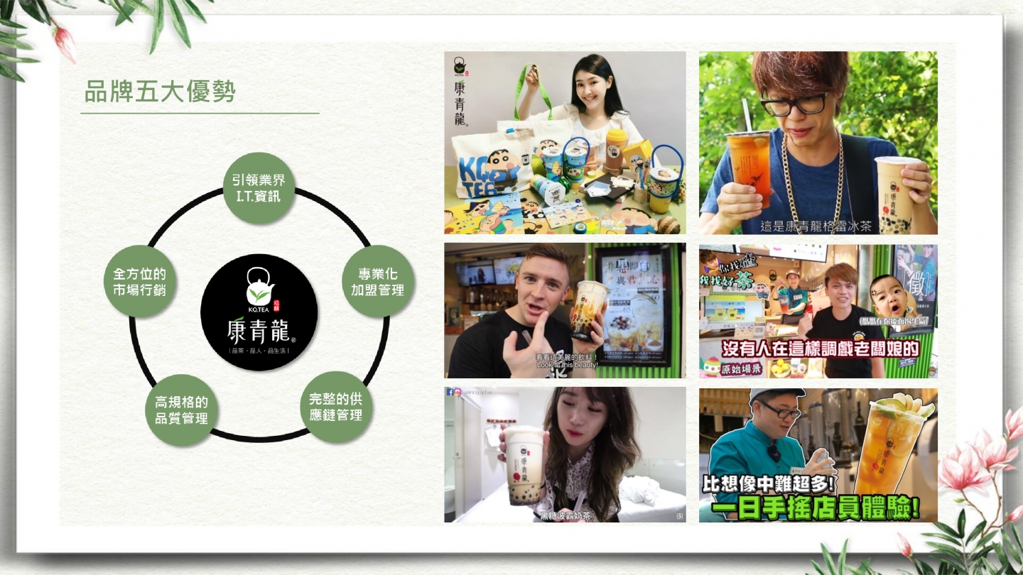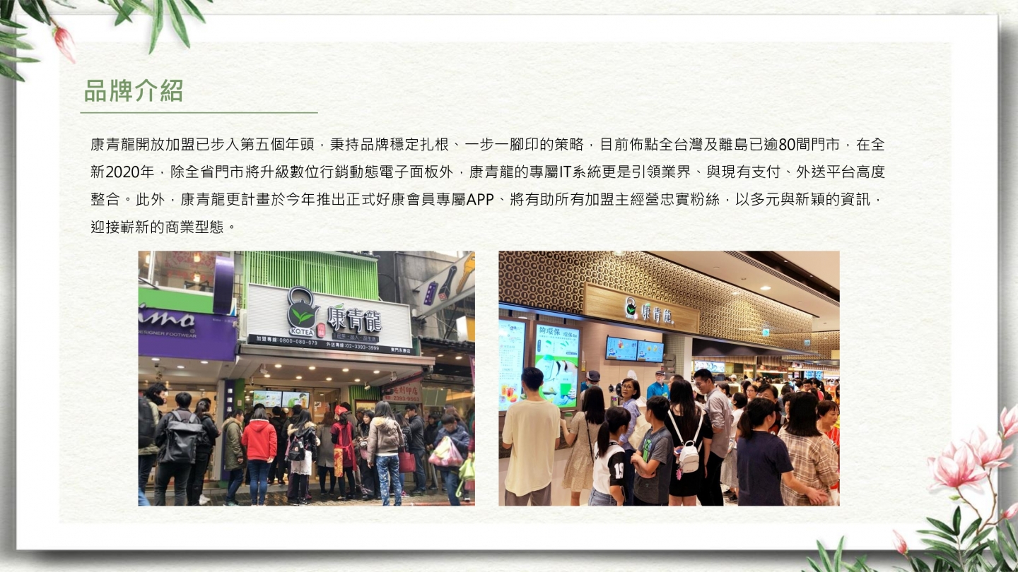 康青龍 加盟金:請洽總部 營業項目:手搖飲料 總店數:全台約80間門市 總部地址:台北市大安區永康街2-7號 加盟專線:0800-088-079 FB粉絲團: https://www.facebook.com/kqltea/?ref=bookmarks 官網連結