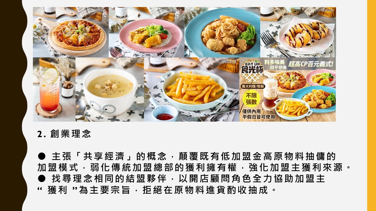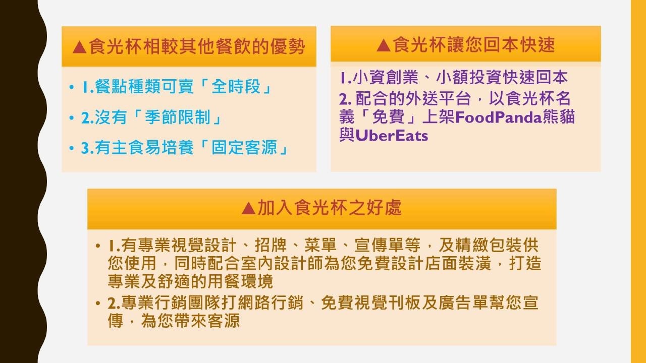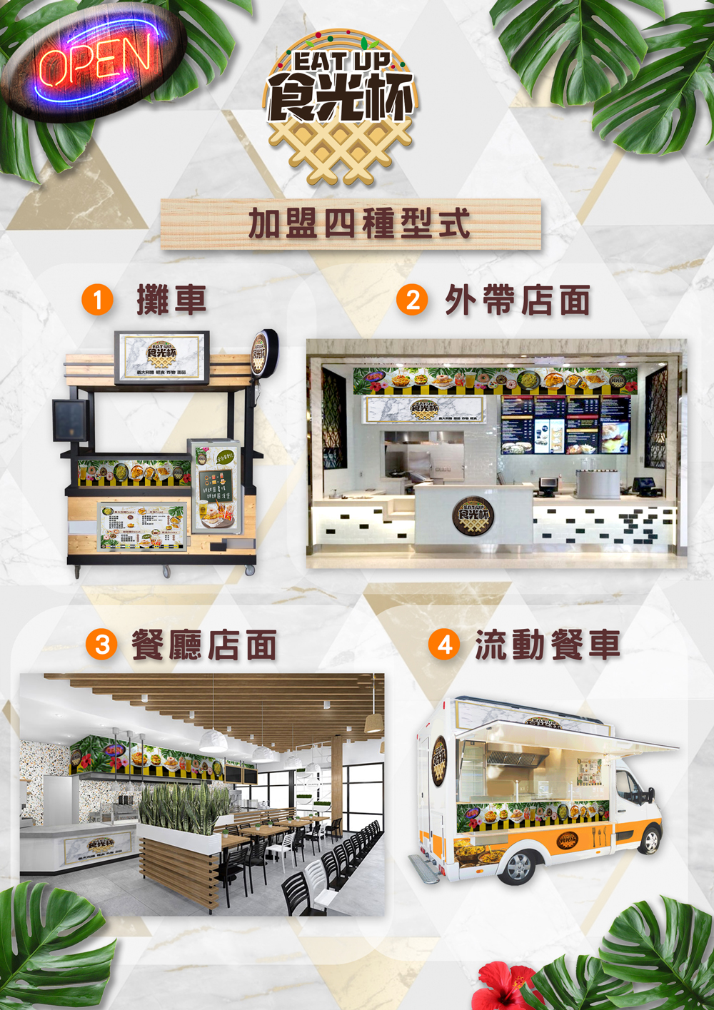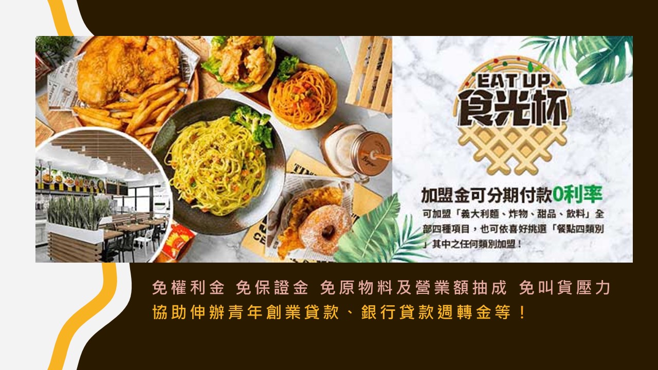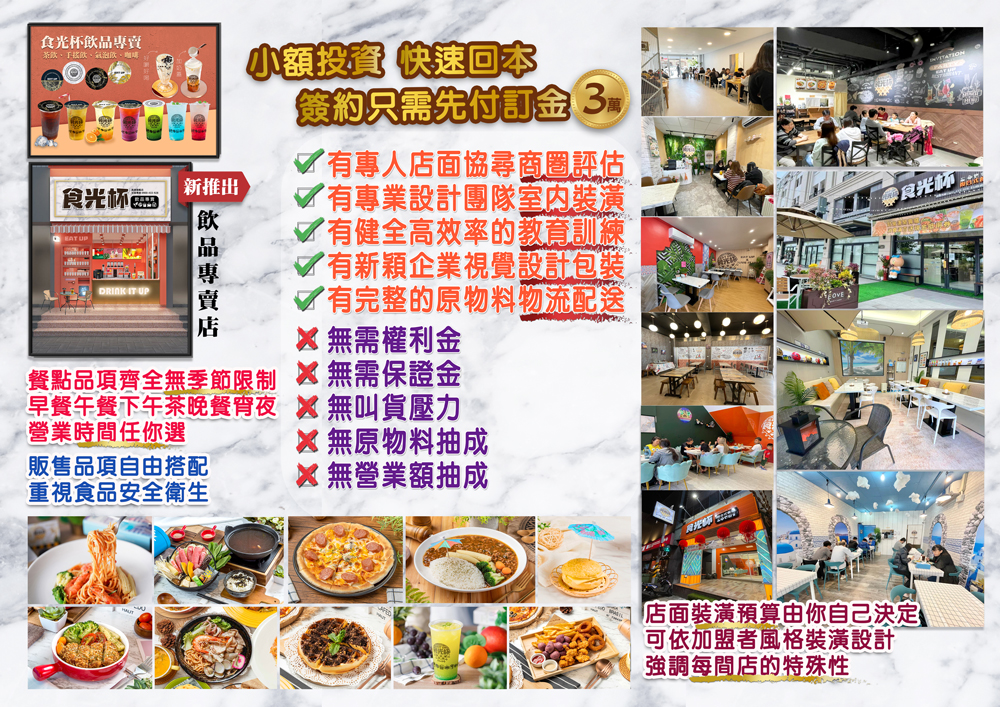 食光杯 複合式餐飲 加盟金:45萬起,詳情請洽總部 營業項目:義大利麵、複合式餐飲 總店數:全省51家分店 加盟專線:0900-433-928 / Email:eatupcup@gmail.com FB粉絲團: https://www.facebook.com/eatupcup 官網連結