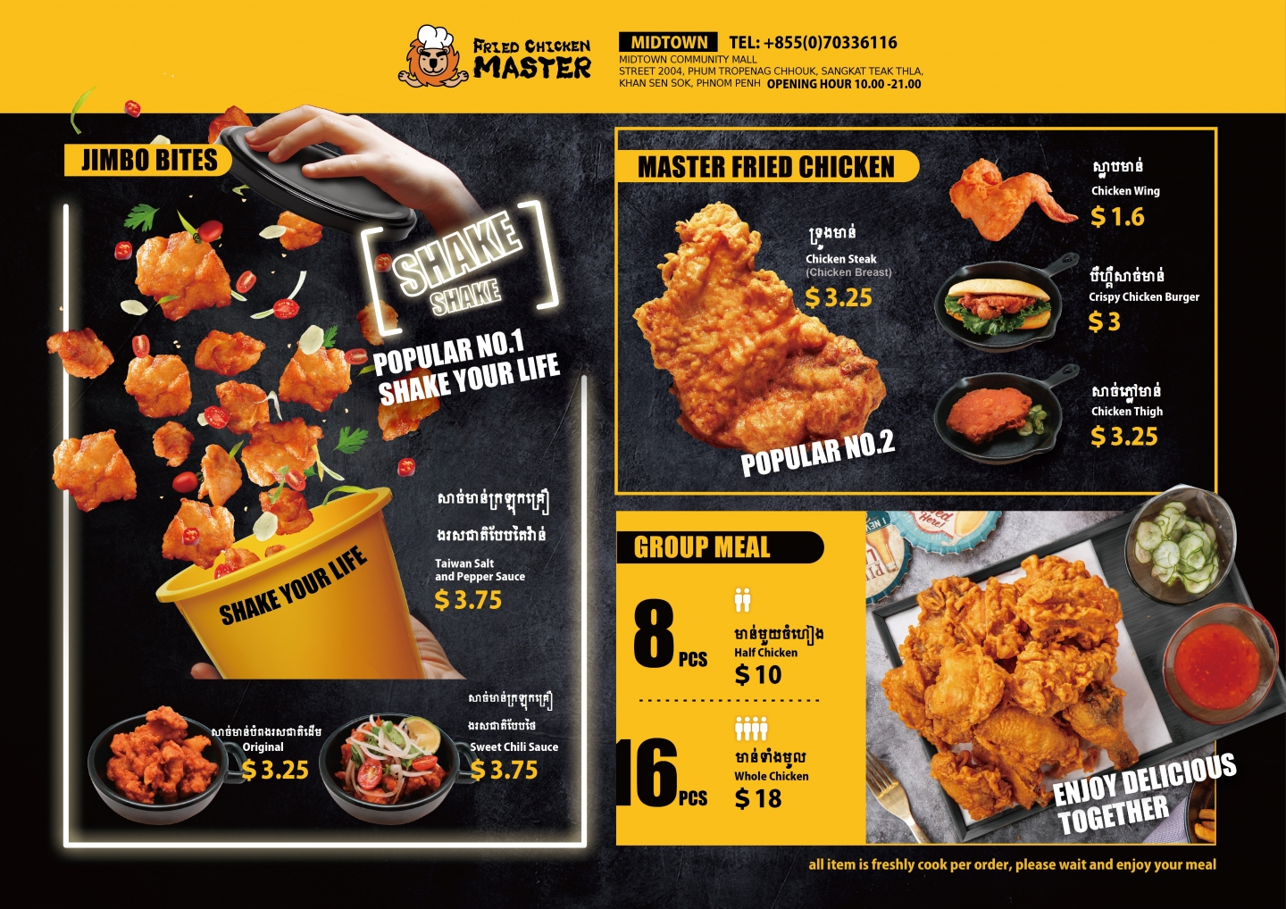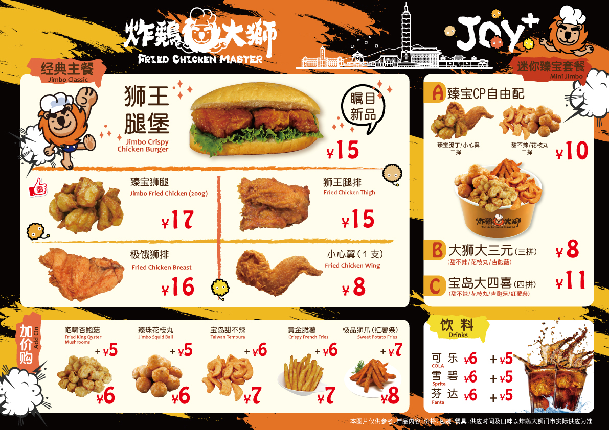 When Fried Chicken Master first burst onto the scene in Taiwan in 2014, it immedi-ately became the talk of town with people waiting in long queues to purchase our products. The tremendous success took the Taiwanese fast food industry by storm. Young students and office ladies alike enjoy Fried Chicken Master. For instance, our star product “JIMBO” fried chicken offers crispy exterior with tender, succulent interior. Take one bite, and the “fragrant flavor of happiness and juiciness will ex-plode in your mouth”. Fried Chicken Master is a hip snack guaranteed to spice up your party, and it is the perfect companion for young people to hang out and forge a timeless friendship!