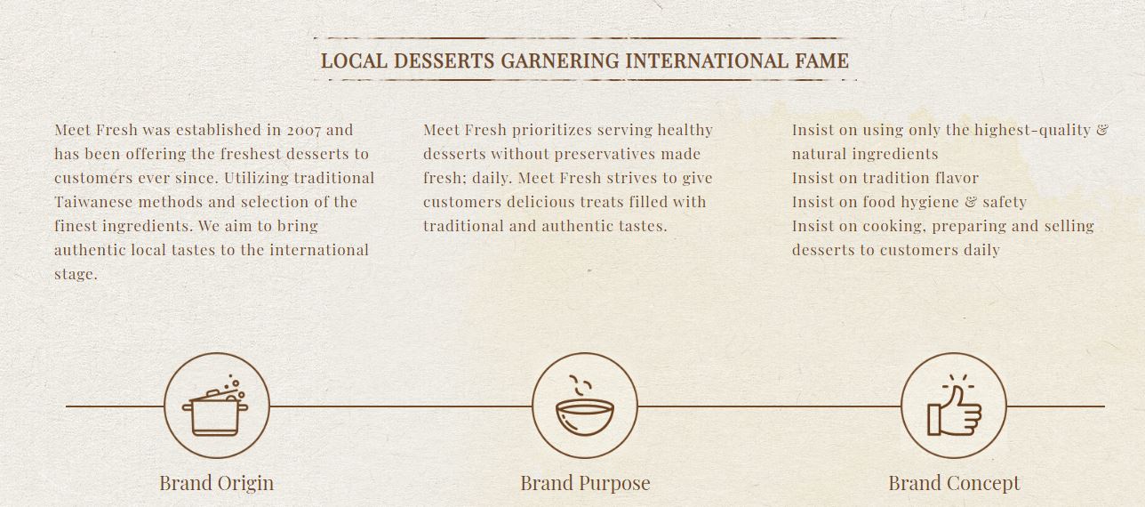 Meet Fresh is coming from the private home-style dessert and offering desserts with freshest ingredients and no preservative. Making a breakthrough from traditional business model in early days to a 6-star exquisite and fashionable dessert store, especially the best seller, “Meet Fresh Signature grass jelly”, has gripped the hearts of people for its good grace and reputation profoundly. More than 28 years of experience in franchise sales & development and in international trade, we have a great ambition to expand Meet Fresh, a growing brand, to global markets aggressively and have expanded our operation into eleven countries/area, including Taiwan, China, Australia, New Zealand, Vietnam, U.S.A., Canada, Japan, UK, Philippines, and Thailand.