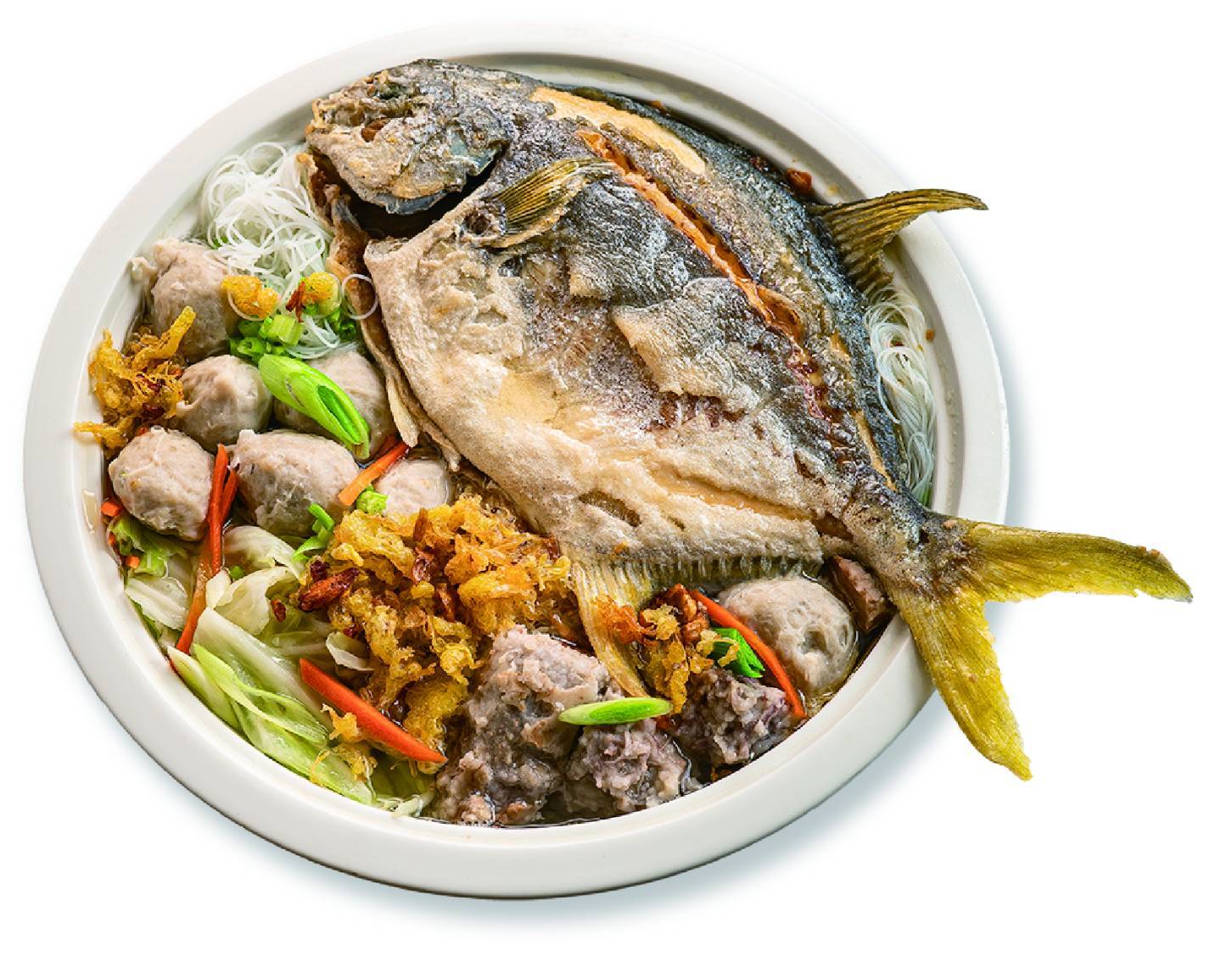 Rice vermicelli with gold pomfret and taro