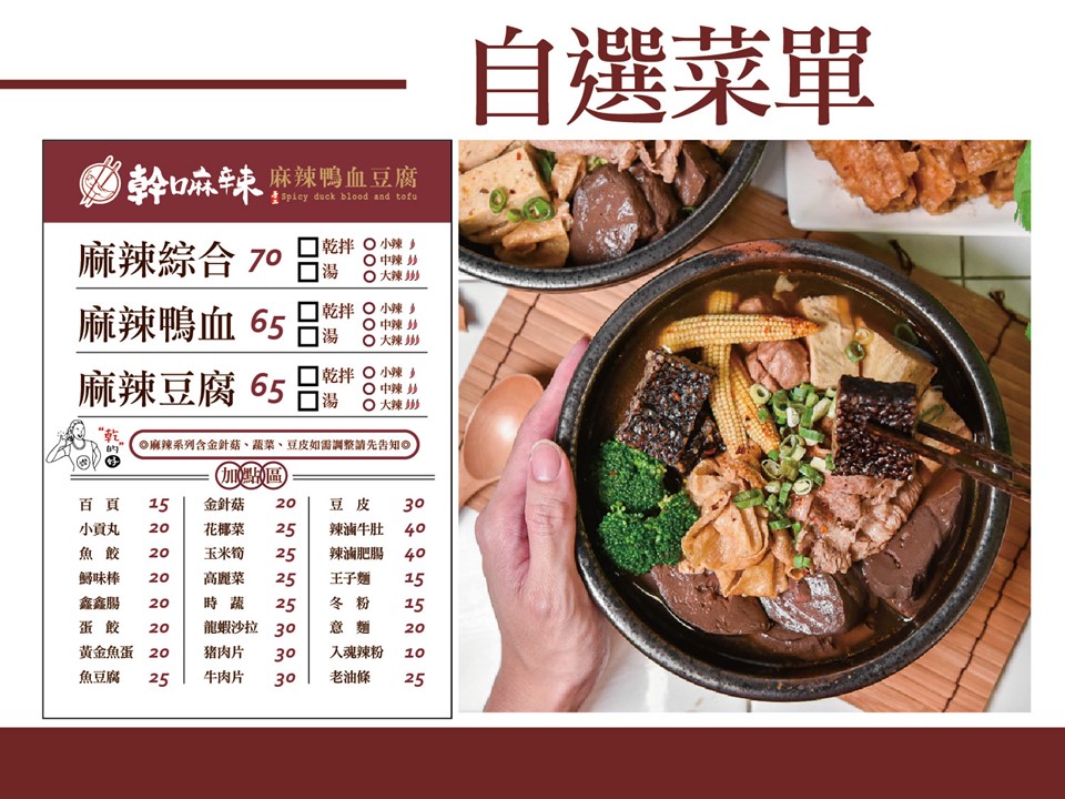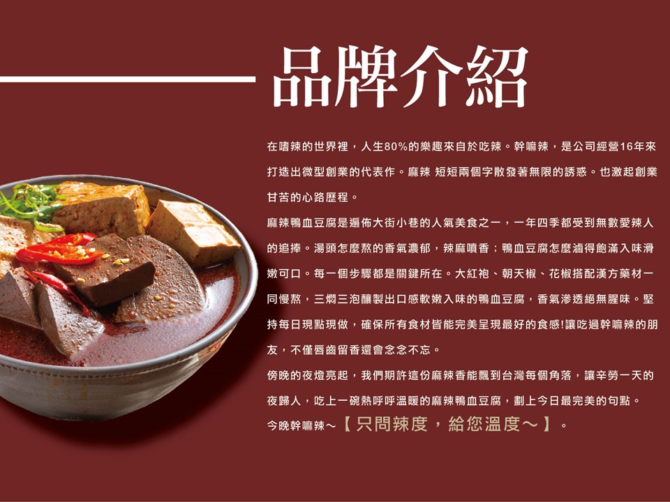 幹嘛辣 麻辣鴨血豆腐 Spicy duck blood and Tofu Year Established: 2019 Category: Taiwanese Cuisine Stores in Taiwan: 1 Franchise Type: Regional Franchise,Materials, Know-How Website